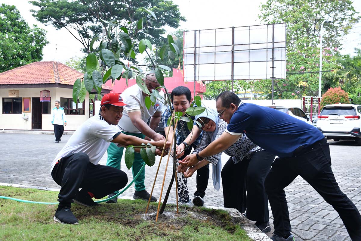 SURABAYA: Badan Kesatuan Bangsa dan Politik (Bakesbangpol) Provinsi Jawa Timur menggelar aksi tanam pohon di halaman kantor dinas yang berada di Kawasan Putat Indah, Surabaya, Jumat (24/10/2025).