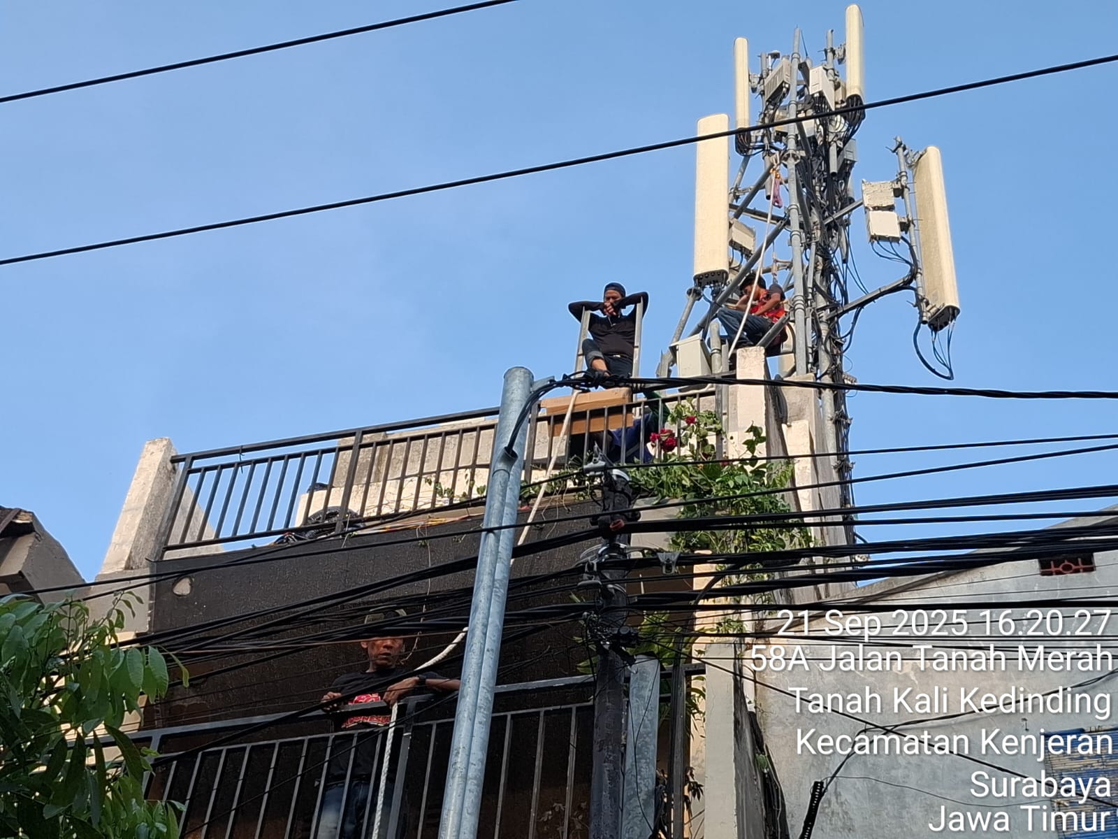 Surabaya – Sebuah tower milik PT Mitratel menjulang tinggi di atas bangunan rumah warga di Jalan Tanah Merah, Kelurahan Tanah Kalikedinding, Kecamatan Kenjeran, Surabaya. Pembangunan tersebut diduga belum mengantongi izin resmi dari dinas terkait. Minggu (21/9)