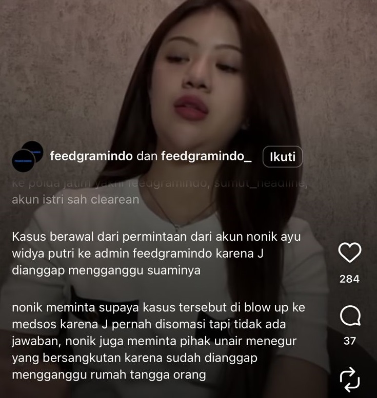 “Nonik meminta supaya kasus tersebut di blow up medsos, karena J pernah disomasi namun tidak ada jawaban. Nonik juga meminta pihak Unair menegur yang bersangkutan karena dianggap sudah mengganggu rumah tangga orang, ” tulis akun ig @feedgramindo menanggapi laporan Jesica ke Polda Jatim.