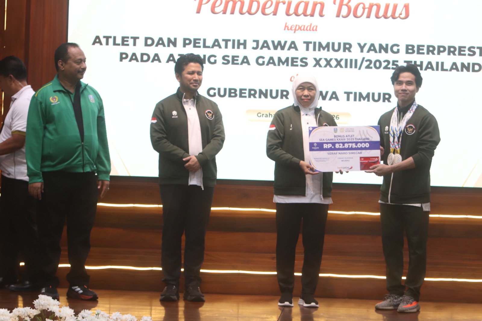 Surabaya – Gubernur Jawa Timur Khofifah Indar Parawansa memberikan bonus kepada atlet dan pelatih yang berkontribusi menyumbangkan medali bagi Indonesia pada ajang SEA Games 2025 Thailand. Penyerahan bonus digelar di Gedung Negara Grahadi, Surabaya, Jumat (30/1/2026), sebagai bentuk apresiasi atas prestasi atlet Jawa Timur di level internasional.