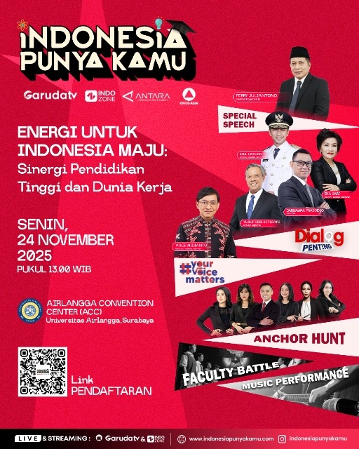 Surabaya, 22 November 2025 – Gerakan Indonesia Punya Kamu kembali digelar dengan semangat baru melalui acara bertema “Energi untuk Indonesia Maju: Sinergi Pendidikan Tinggi dan Dunia Kerja” yang akan berlangsung pada Senin, 24 November 2025 di Airlangga Convention Center (ACC), Universitas Airlangga (UNAIR), Surabaya.