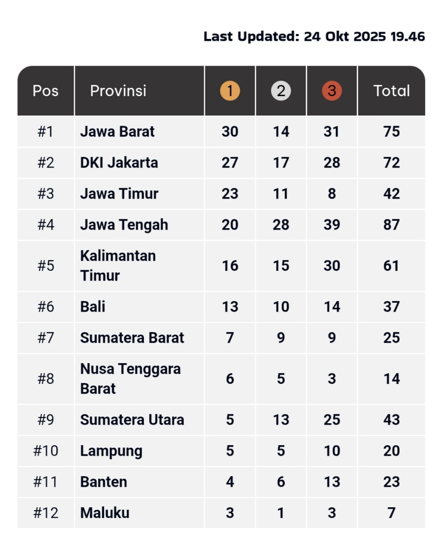 Jatim berada diperingkat ketiga dengan 23 emas, 11 perak, 8 perunggu. Jabar masih kokoh diperingkat pertama dengan 30 emas, 14 perak, 31 perunggu, disusul DKI Jakarta 27 emas, 17 perak, 28 perunggu dan Jateng diperingkat empat 20 emas, 28 perak, 39 perunggu.