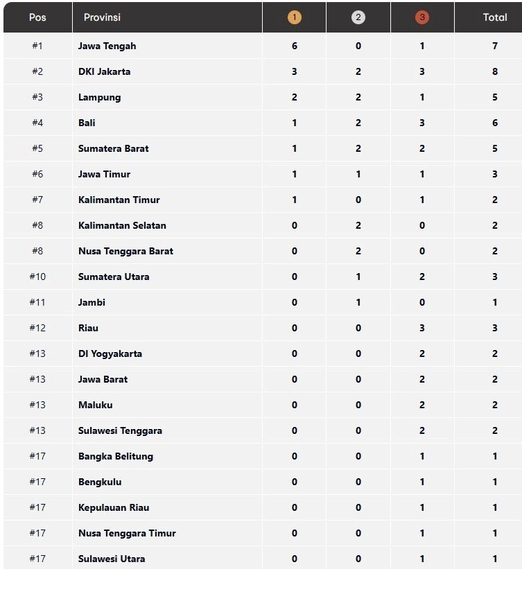 Sementara itu, posisi kedua ditempati oleh kontingen DKI Jakarta dengan torehan tiga emas, dua perak, dan satu perunggu. Disusul oleh Lampung di peringkat ketiga dengan dua emas, dua perak, dan satu perunggu.