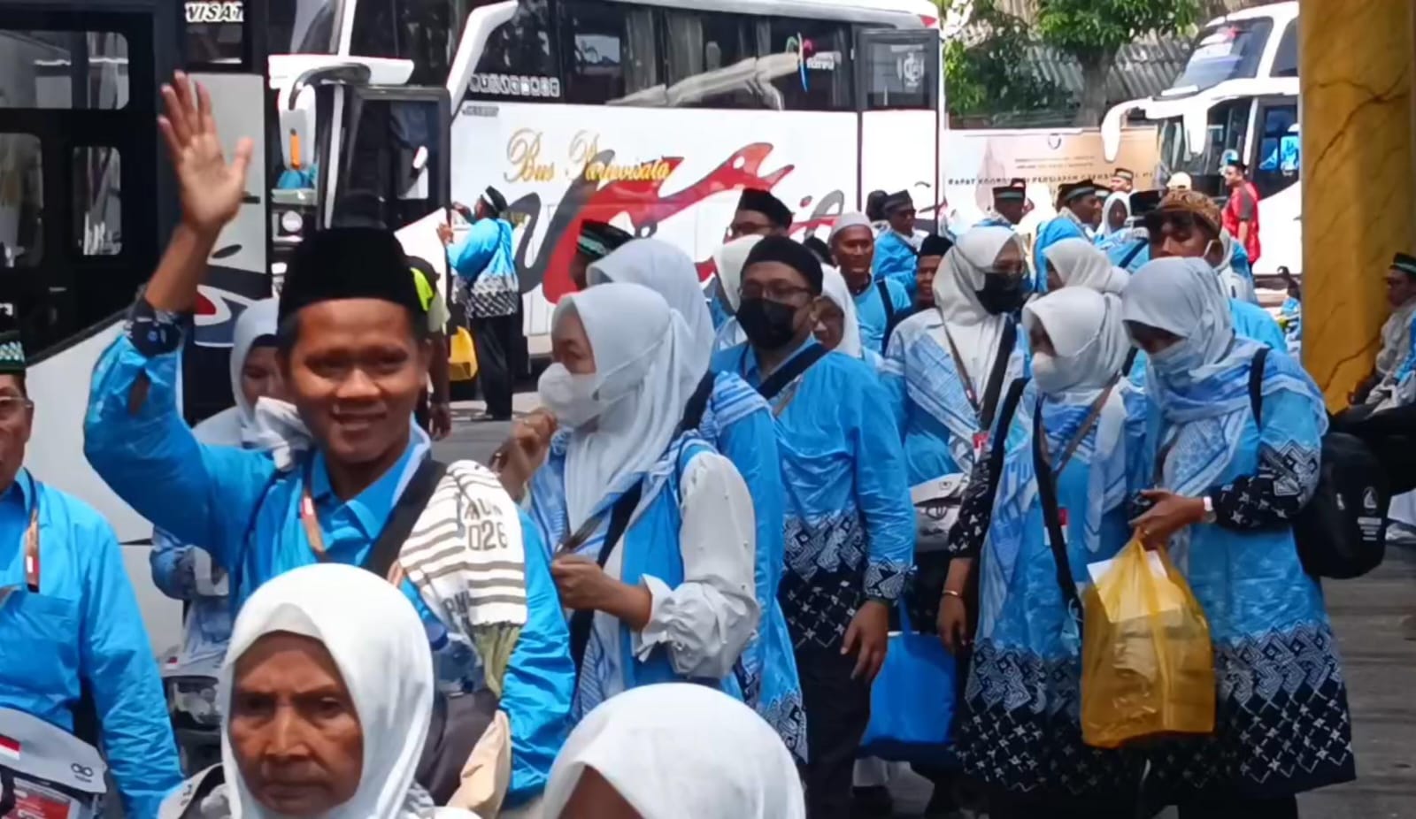Para jamaah turun dari bus dengan membawa koper dan perlengkapan ibadah, disambut petugas yang langsung mengarahkan mereka menuju lokasi pendataan. Tidak sedikit keluarga yang mengantar terlihat menitikkan air mata haru saat melepas keberangkatan orang terdekat mereka.