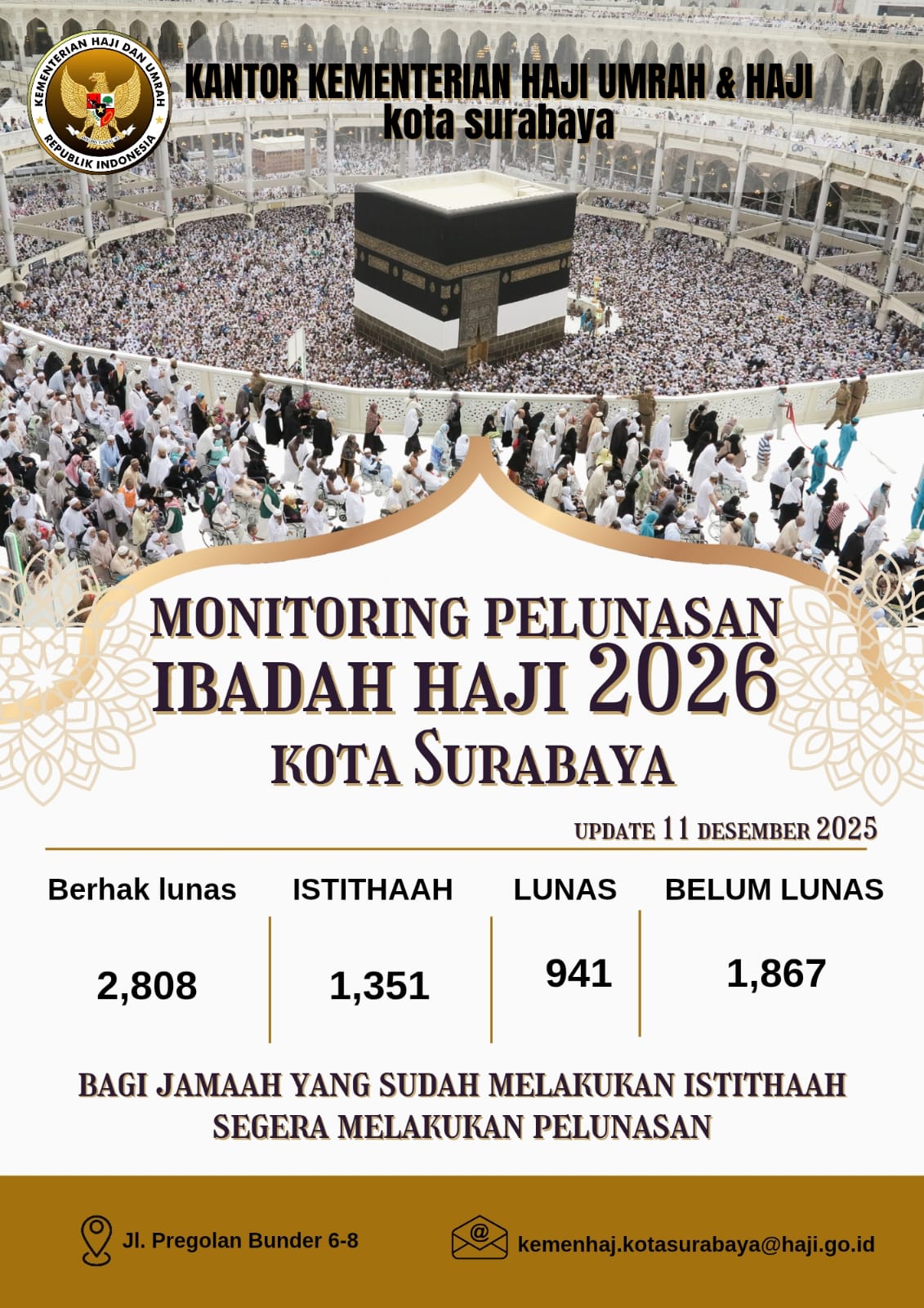 SURABAYA: Masa pelunasan biaya haji 2026 tinggal 7 hari lagi. Namun dari total 2.808 calon jemaah haji regular asal Surabaya, sebanyak 1.867 orang atau 66 persen belum melakukan pelunasan. Sedangkan yang sudah melakukan pelunasan baru 34 persen, yaitu 941 jamaah.