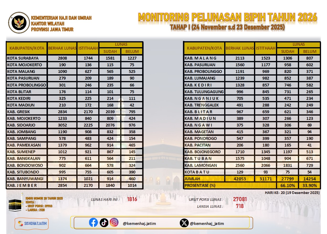 Sementara dari data terbaru, meski masa pelunasan tahap I tinggal tiga hari lagi, namun dari total 2.808 jemaah berhak lunas, ternyata baru sekitar 1.581 jemaah yang sudah melakukan pelunasan. Artinya, masih ada sekitar 1.227  calon jemaah haji dari Surabaya yang belum melakukan pelunasan.
