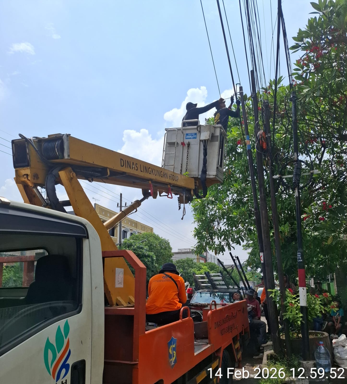 SURABAYA – Pemerintah Kota Surabaya bersama Satpol PP dan dinas terkait menertibkan kabel fiber optik (FO) tak berizin serta tiang WiFi ilegal di kawasan Putra Agung, Kapas Krampung, Kecamatan Tambaksari, Surabaya, Sabtu (14/2/2026).