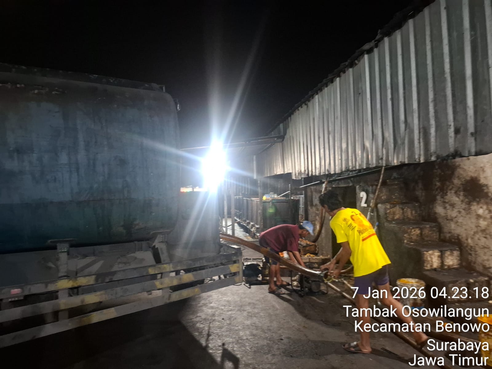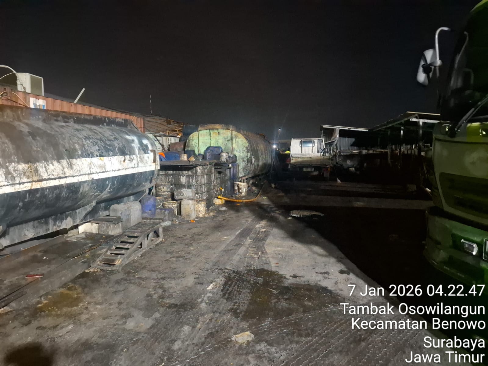 Dari foto-foto yang beredar, aktivitas tersebut terekam pada pukul 03.16 WIB di Tambak Sarios dan 04.22 WIB di Tambak Osowilangun. Mobil tangki berwarna hijau-biru tampak berhenti di dekat tepian tambak, sementara sejumlah pekerja melakukan proses pemindahan cairan tanpa menggunakan Alat Pelindung Diri (APD) yang memadai.