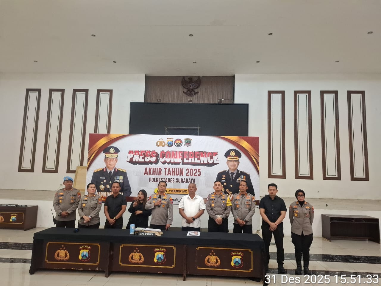 Surabaya – Polrestabes Surabaya menggelar rilis Analisis dan Evaluasi (Anev) akhir tahun 2025, Selasa (31/12/2025). Kegiatan tersebut dipimpin langsung Kapolrestabes Surabaya yang didampingi Kasatreskrim, Kasatlantas, dan Kasihumas.